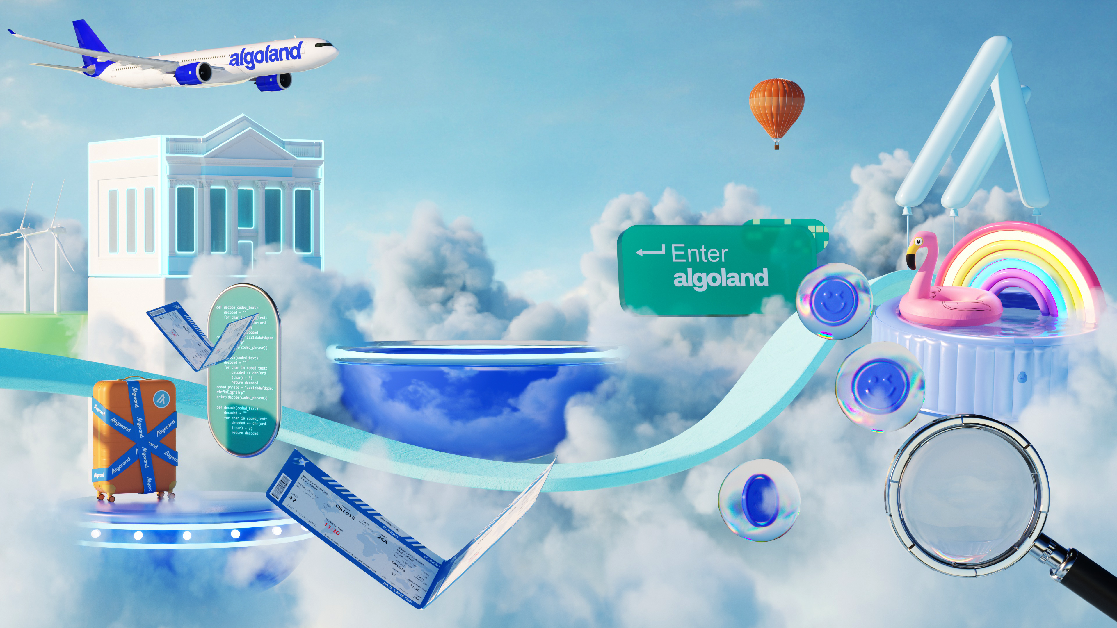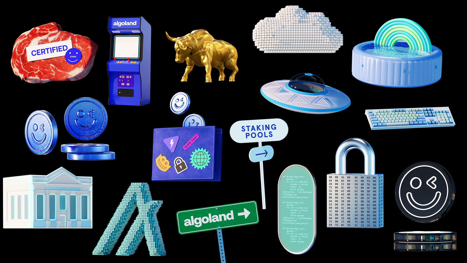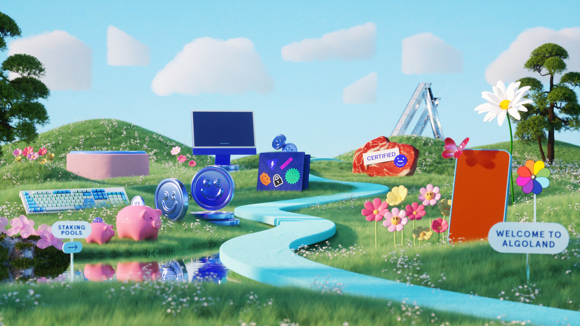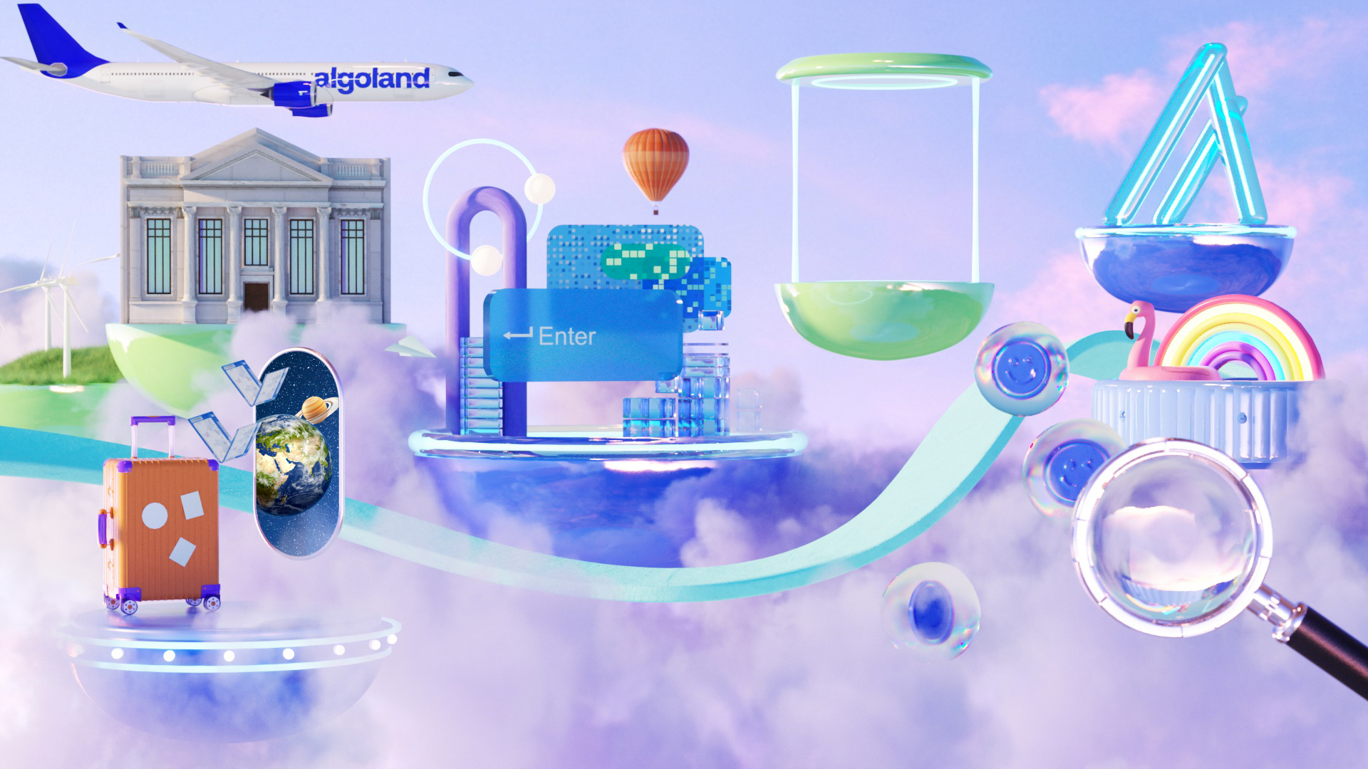 For the launch of Algorand’s new digital platform, “Algoland,” we designed an extensive suite of 3D illustrations, landscapes, and animated assets designed to live seamlessly across web, digital, and social platforms. The deliverables included a 30-second hero animation featured on both Algorand and Algoland’s websites, alongside four key 3D visual worlds and looping animations inspired by core elements of the platform - DeFi, staking, NFTs, and gaming. These vibrant, exploratory environments brought the spirit of the Algorand ecosystem to life and served as background visuals across digital and social touchpoints. We also delivered 15 standalone 3D illustrations, used as icons and modular graphics throughout the platform’s webpages, expanding the brand’s visual identity into a cohesive, dynamic system.