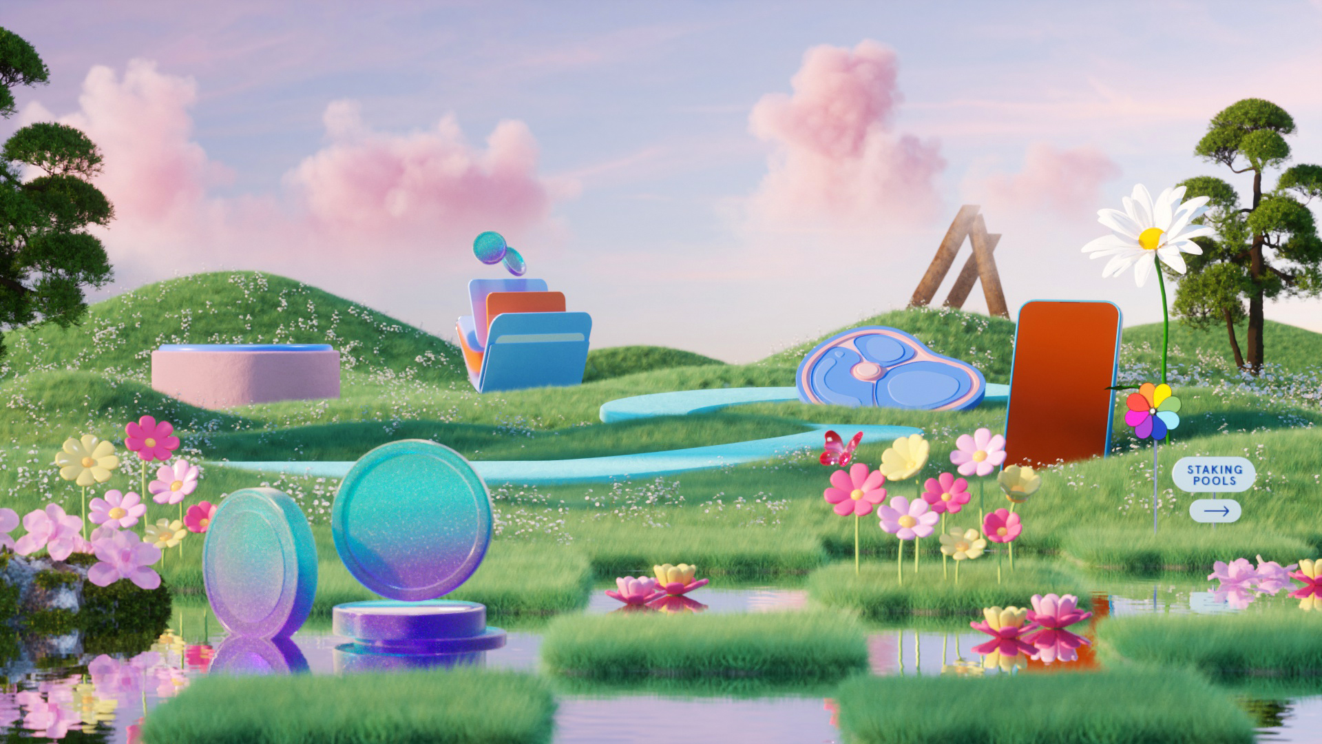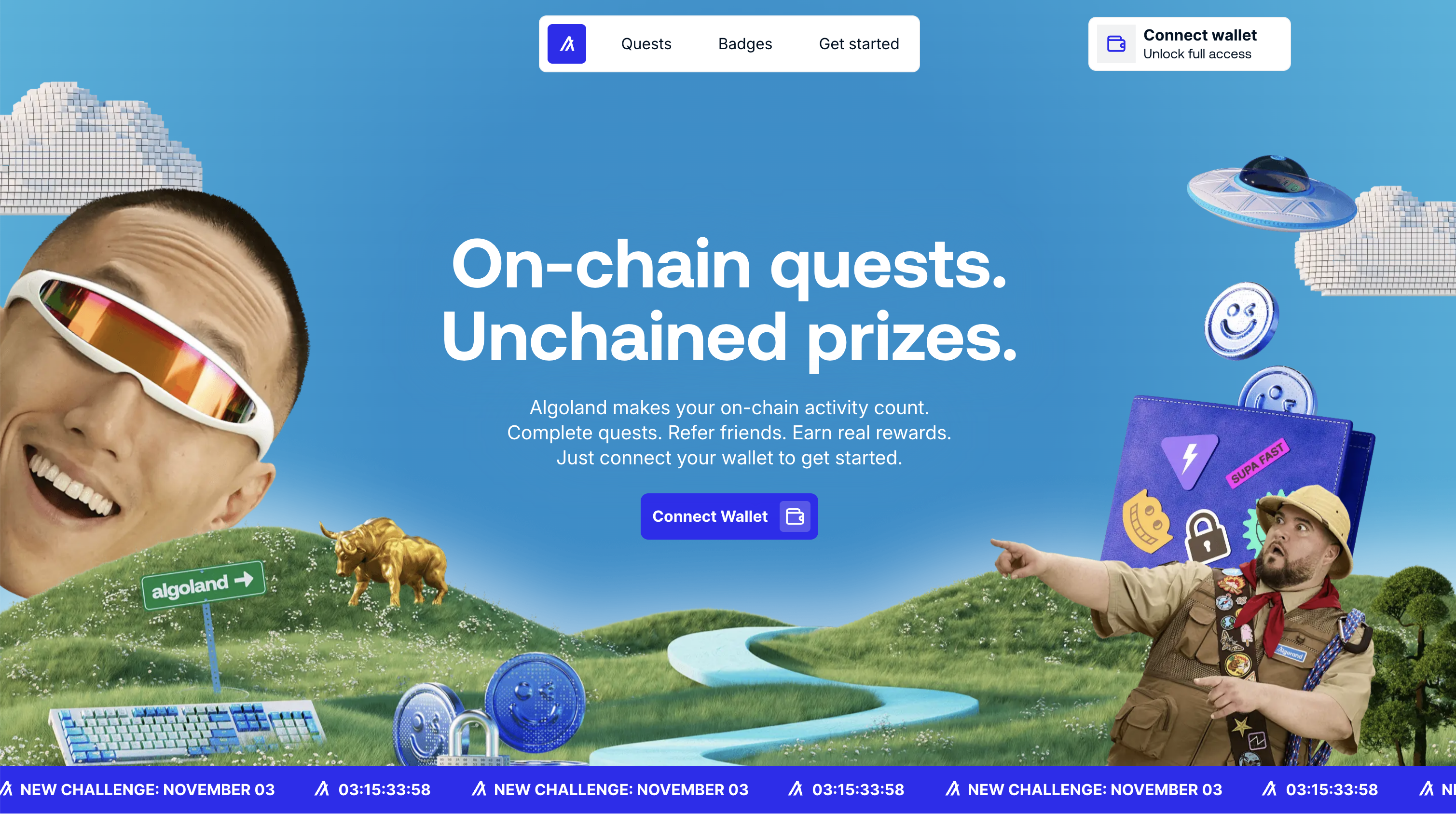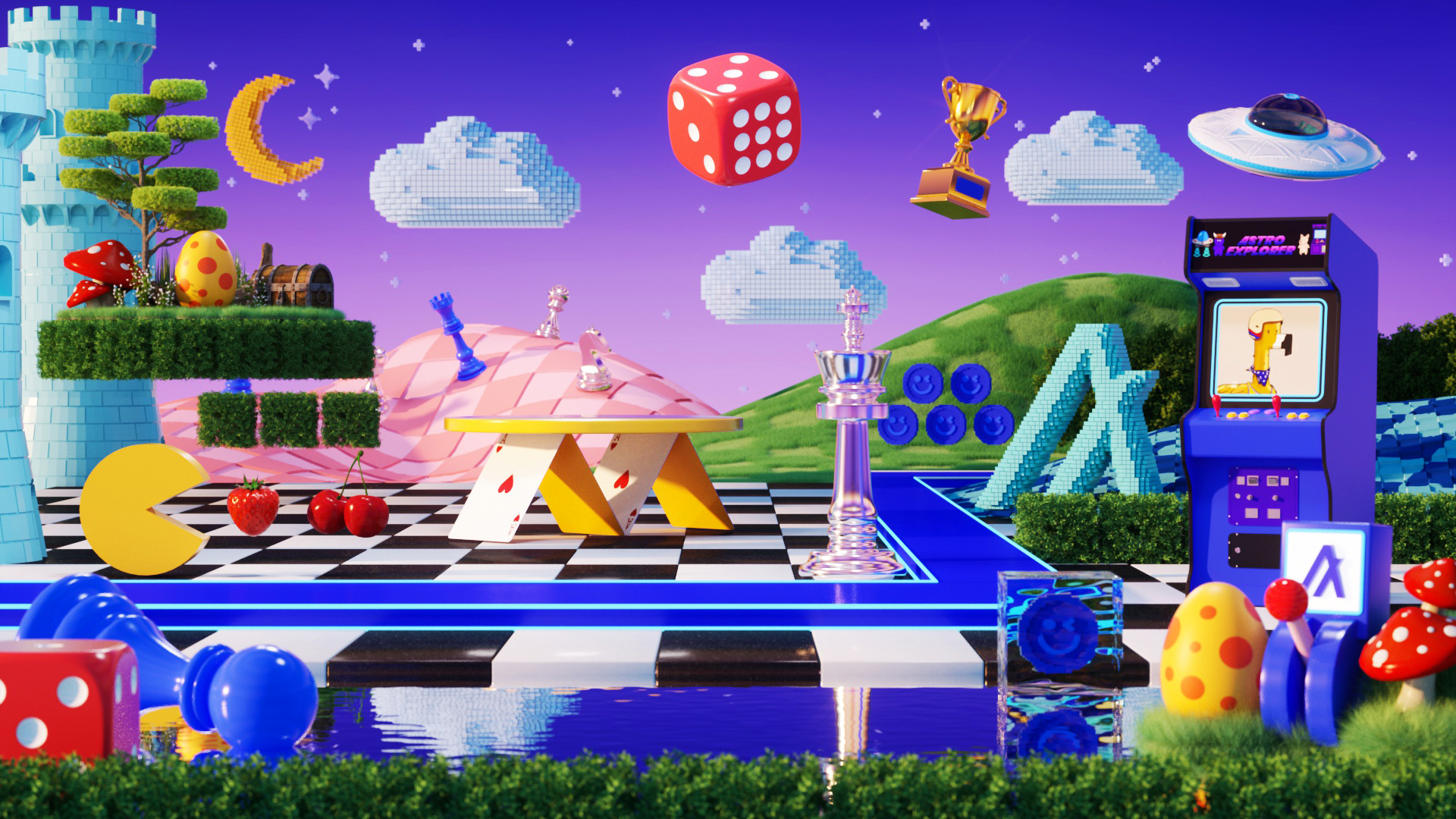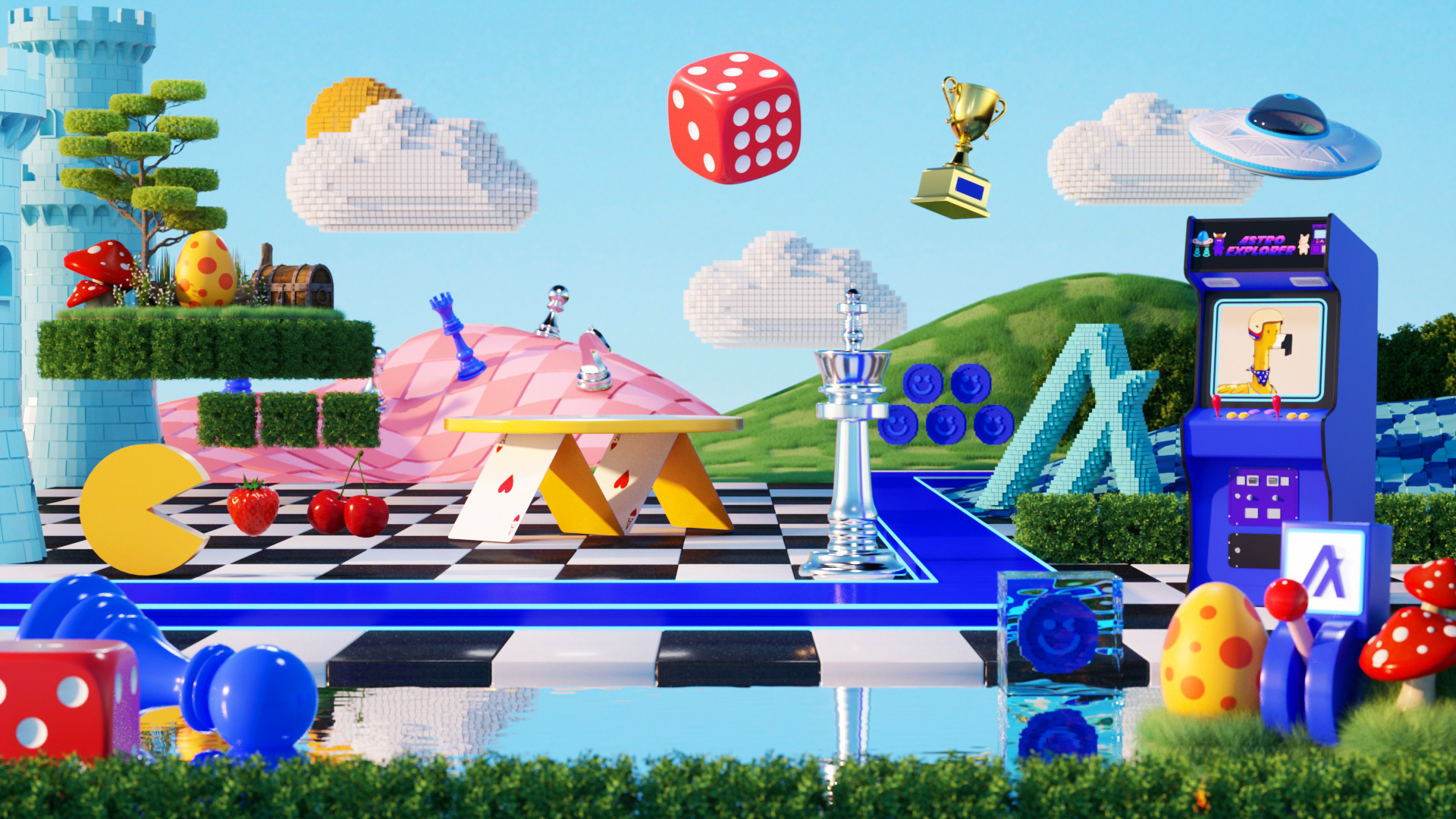 For the launch of Algorand’s new digital platform, “Algoland,” we designed an extensive suite of 3D illustrations, landscapes, and animated assets designed to live seamlessly across web, digital, and social platforms. The deliverables included a 30-second hero animation featured on both Algorand and Algoland’s websites, alongside four key 3D visual worlds and looping animations inspired by core elements of the platform - DeFi, staking, NFTs, and gaming. These vibrant, exploratory environments brought the spirit of the Algorand ecosystem to life and served as background visuals across digital and social touchpoints. We also delivered 15 standalone 3D illustrations, used as icons and modular graphics throughout the platform’s webpages, expanding the brand’s visual identity into a cohesive, dynamic system.