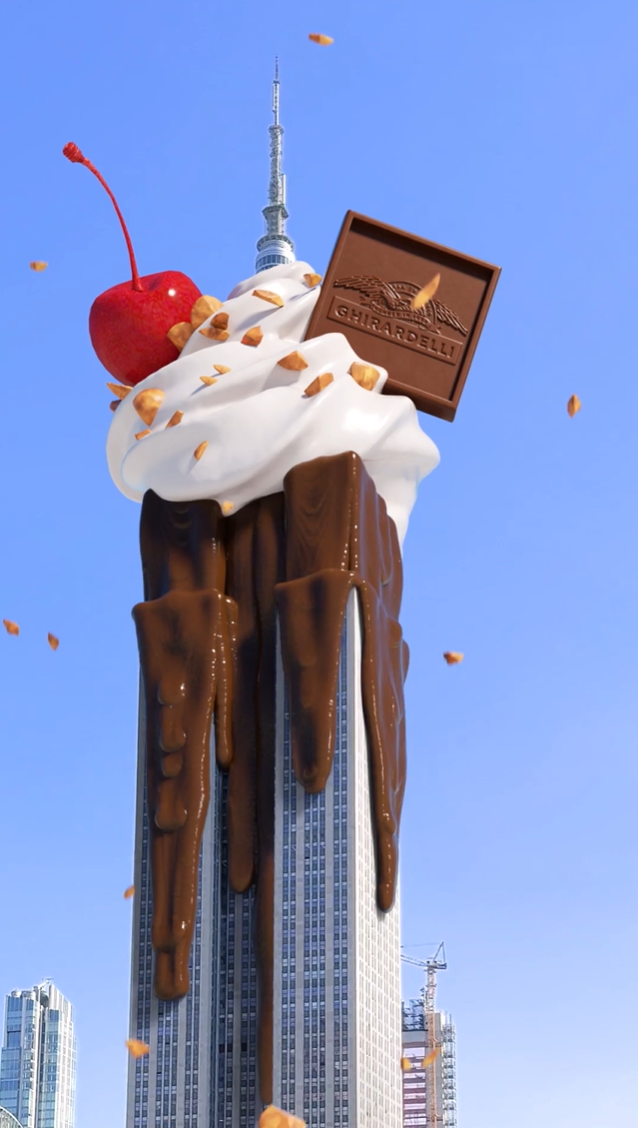 A mixed-reality CGI campaign for Ghirardelli, transforming New York City into a surreal, oversized dessert world to mark the brand’s first East Coast store.