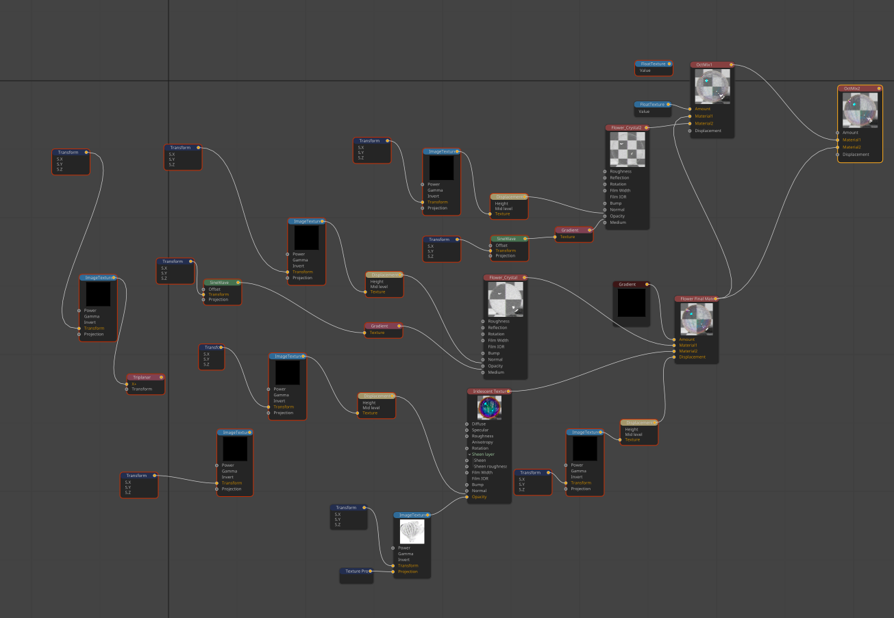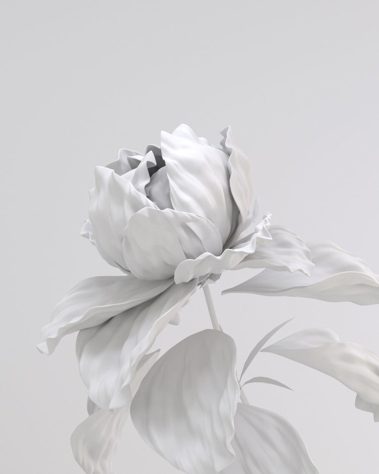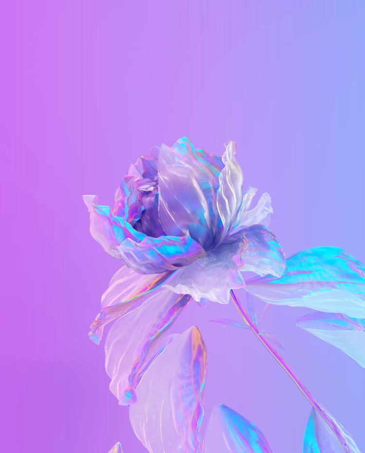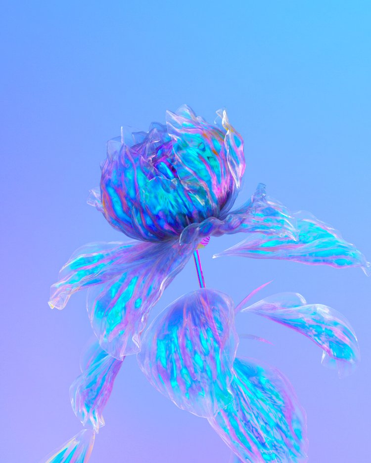 In the process of crafting materials, we spent months experimenting and mixing both specular, opaque, and displacement textures. Our custom material generates new, iridescent color combinations as the glass-like petals change under the light and are viewed through different camera perspectives. It was important for us to maintain a level of detail in the texture that showcased each petal’s individual vascular patterns; creating a synthesis between nature and futuristic possibilities. .