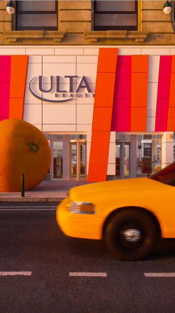 The second piece showcases the Ulta Beauty flagship in New York City, where the orange’s journey continues, culminating in a display of giant Ole products from the Glow Cycle line, playfully arriving in front of the store.