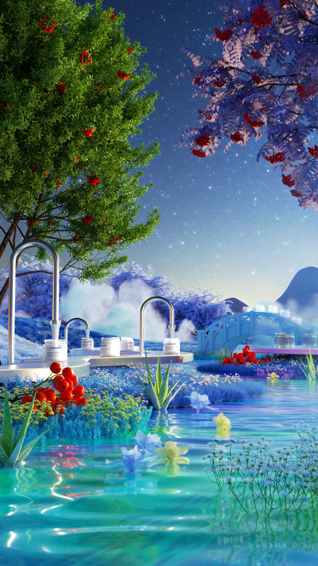 Inspired by the mask’s iridescent hues, glowing properties, and unique ingredients, we created a Dewtopia Garden Factory, where a formula factory interweaves through a lush garden filled with vibrant Scandinavian Rowanberries, rejuvenating aloe, and shimmering iridescent water.
