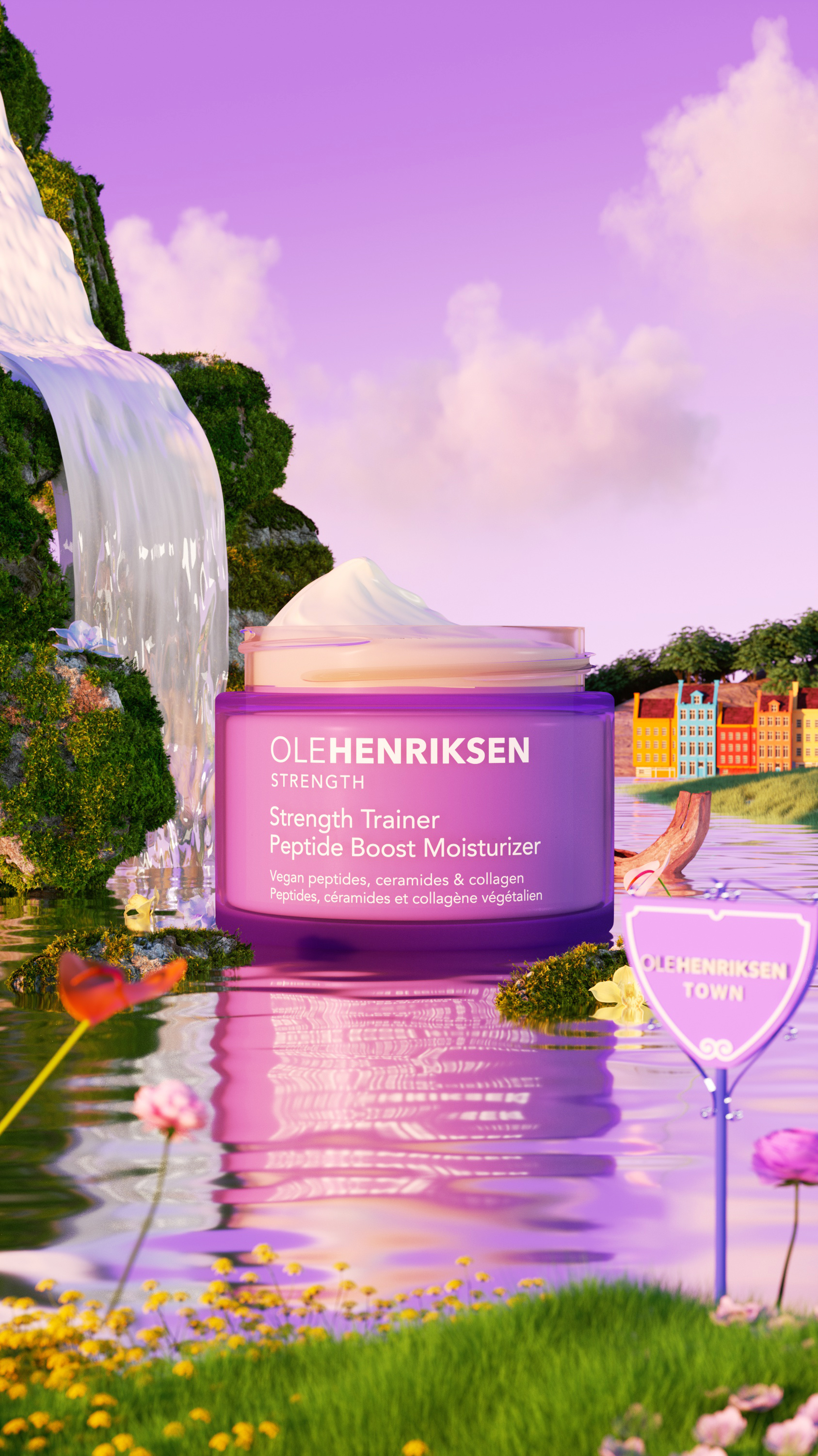 Inspired by its deeply hydrating qualities, the Strength Trainer sees a dry desert bathed in formula to transform into a beautiful waterfall oasis, named Ole Henriksen Town.