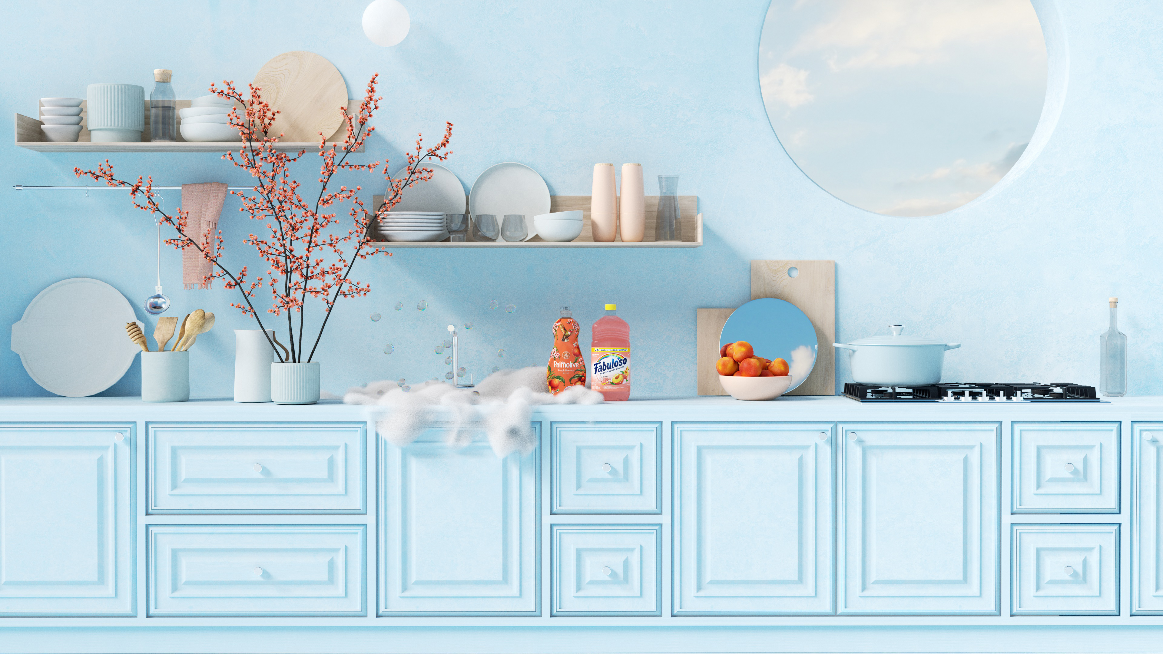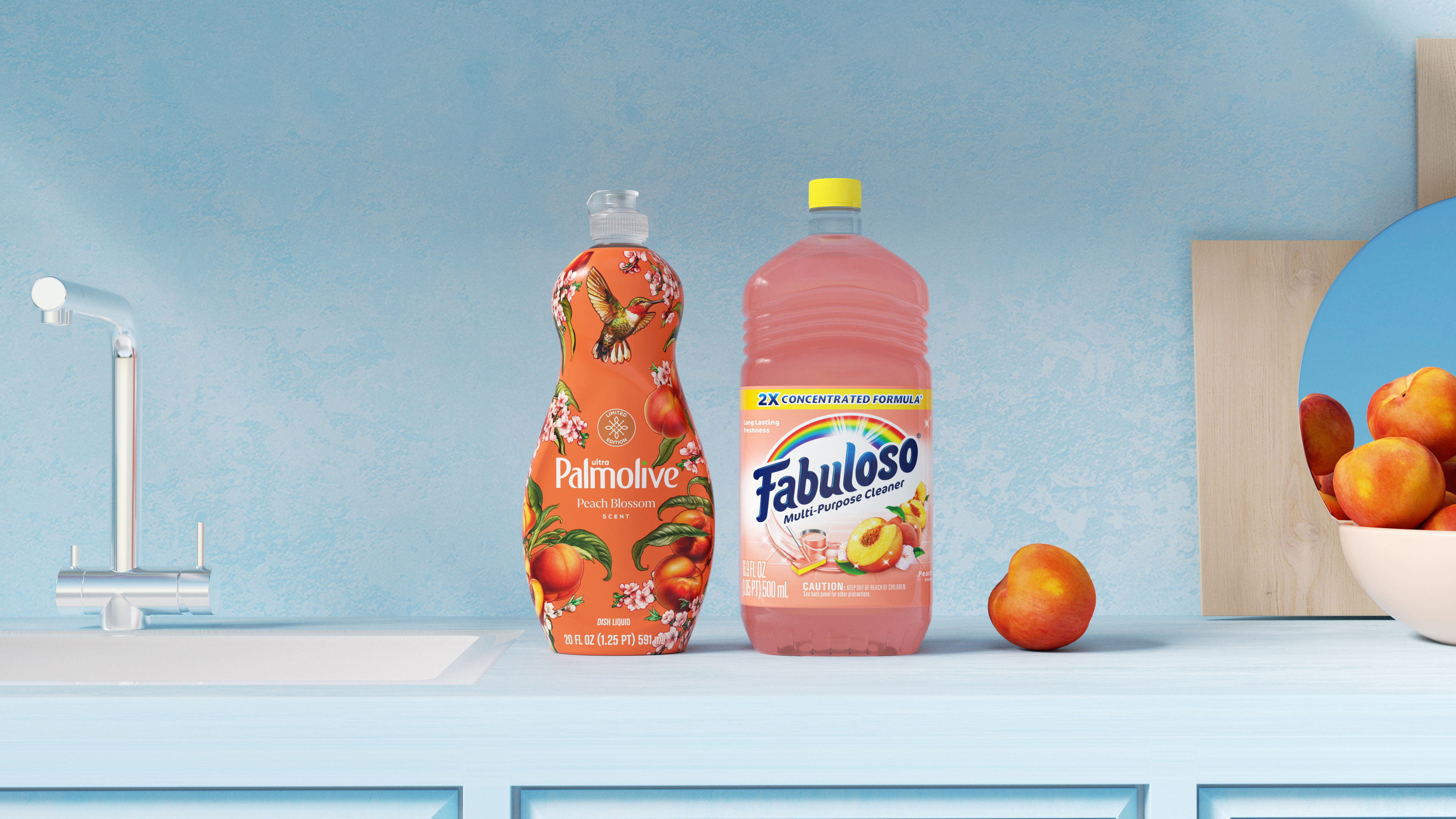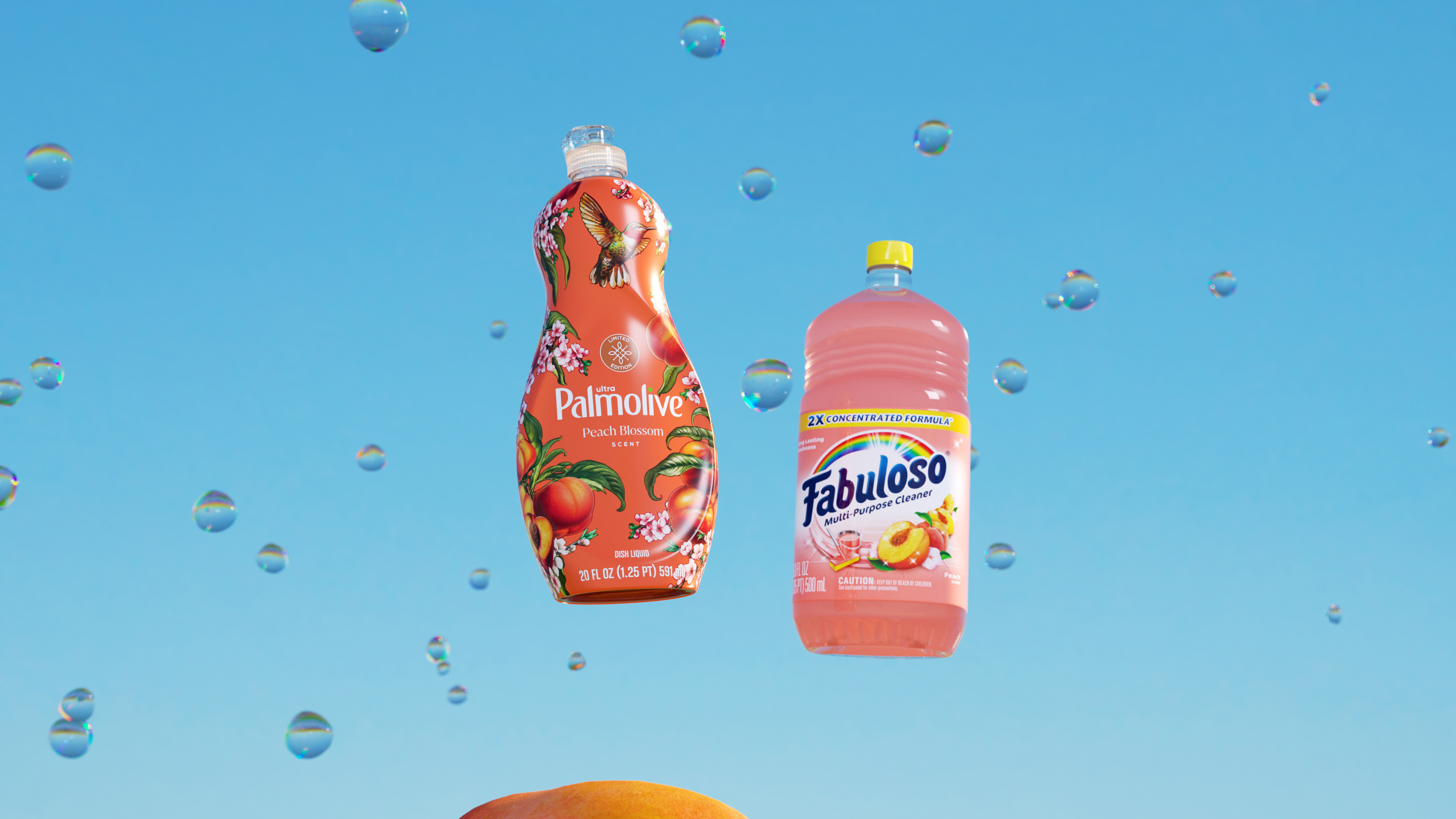 A CGI campaign for Palmolive, bringing the new Peach Dish Wash and Fabuloso cleanser to life through a playful, spring-inspired world.